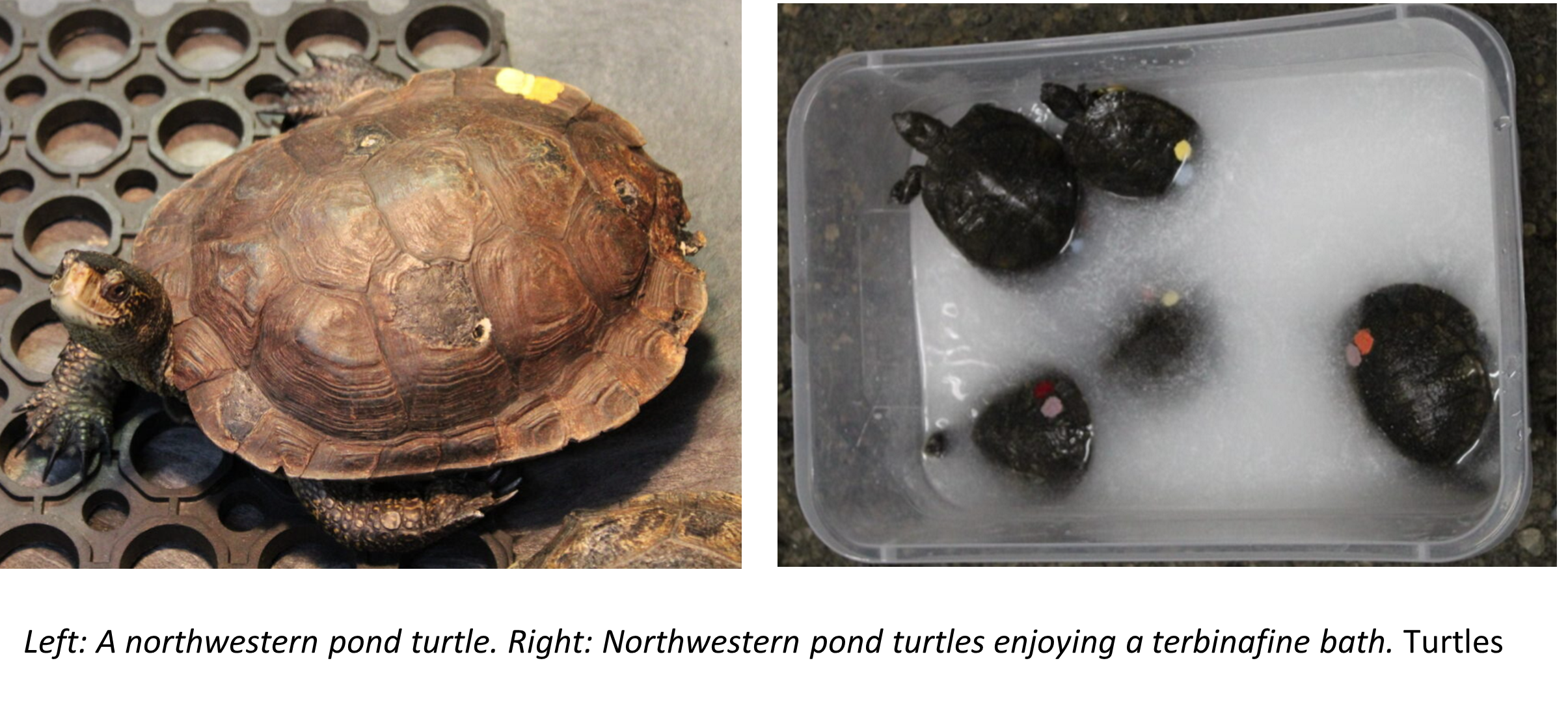 SPP is partnering with WDFW to pilot a less invasive treatment option for these turtles. Based on research from the University of IllinoisWildlife Epidemiology Lab, SPP is administering an anti-fungal treatment bath for the turtles. Three times a week turtles soak for 30 minutes in a terbinafine and water solution to coat them in the medicine, in hopes of clearing them of the fungal pathogen.